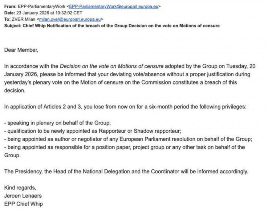 Evropskega poslanca dr. Milana Zvera so v EPP po glasovanju o nezaupnici Evropski komisiji danes uradno obvestili o uvedbi začasnih sankcij proti njemu, ker ni upošteval uradnega stališča skupine, da se glasuje proti nezaupnici. Predlog nezaupnice, ki ga je vložila skrajna desnica v Evropskem parlamentu zaradi sklenitve trgovinskega sporazuma med EU in južnoameriškim trgovinskim blokom Mercosur, je bil že četrti za drugo komisijo pod vodstvom Nemke Ursule von der Leyen iz vrst EPP, ki je mandat nastopila decembra 2024. Vse štiri predloge nezaupnic je Evropski parlament zavrnil.