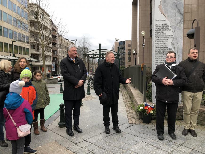 Na pobudo pisarne evropskega poslanca dr. Milana Zvera in Slovenskega pastoralnega centra v Bruslju so danes pri kamnitem obeležju, ki ga je Republika Slovenija leta 2008, ob zaključku svojega prvega predsedovanja Svetu EU, podarila mestu Bruselj, pripravili kratko slovesnost ob današnjem slovenskem kulturnem prazniku. Kulturni program je letos popestril duhovniški oktet OREMUS.