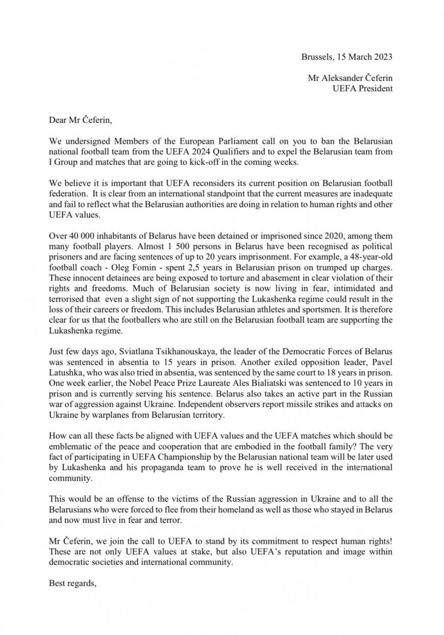 V pismu, ki ga je podpisala vrsta evropskih poslancev, so navedena opozorila o tem, da je od leta 2020 v Belorusiji bilo zaprtih več kot 40.000 ljudi, med njimi tudi vrsta nogometašev. 1500 ljudi je bilo prepoznanih kot političnih zapornikov in se soočajo s kaznijo 20 let zapora. "48-letni nogometni trener je tako preživel že 2,5 leti v zaporu, na podlagi izmišljenih obtožb. Nedolžni zaporniki so izpostavljeni mučenju in kršitvam vseh človekovih pravic in svoboščin. Veliko Belorusov živi v stalnem strahu, da bi jih zgolj ena beseda proti Lukašenkovemu režimu potisnila za zapahe, ali pa v izgubo njihove poklicne kariere. To velja tudi za beloruske športnike. Jasno je, da so nogometaši, ki so del beloruske nogometne ekipe, podporniki Lukašenkovega režima," v pismu izpostavljajo poslanke in poslanci.