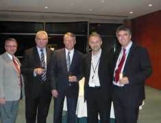 Joseph Daul, predsednik EPP - Evropske ljudske stranke v Evropskem parlamentu, je ob 20-letnici padca berlinskega zidu orgniziral sprejem za evropske poslance. Na sliki Dr. Zver z Mariom Maurom, Reimerjem Bögejem ter z Langenom Wernerjem.